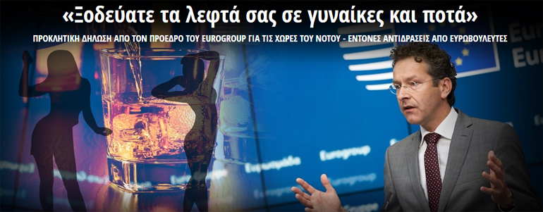 Για τις επόμενες, τουλάχιστον, δύο ημέρες η ελληνική διαπραγματευτική ομάδα θα συνεχίσει πυρετώδεις επαφές στη βελγική πρωτεύουσα, προκειμένου να επιτύχει το καλύτερο δυνατό αποτέλεσμα, μέσα σε ένα κλίμα διόλου θετικό για την Ελλάδα. Ήδη, ο επικεφαλής του Eurogroup φρόντισε με τις νέες του δηλώσεις να δυναμιτίσει την ατμόσφαιρα, επισημαίνοντας ότι ο Νότος πληρώνει τις αμαρτίες του παρελθόντος (ποτά και γυναίκες), με τον Βορρά να στέκεται στο πλευρό του, να δείχνει αλληλεγγύη, προσφέροντάς του ένα σωσίβιο (μέσω -φυσικά- μνημονίων που συνοδεύονται από σκληρά μέτρα λιτότητας).