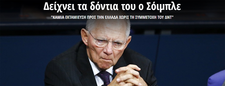 Παράλληλα, ο Βόλφγκανγκ Σόιμπλε εμμένει στη σκληρή γραμμή, ξεκαθαρίζοντας ότι δεν θα δοθεί ούτε ένα ευρώ στην Ελλάδα χωρίς τη συμμετοχή του ΔΝΤ, η οποία και παραμένει μετέωρη. Επιπλέον, διεμήνυσε πως η ολοκλήρωση της αξιολόγησης εναπόκειται στους χειρισμούς της ελληνικής κυβέρνησης. Με αυτήν του τη δήλωση έθεσε ουσιαστικά την κυβέρνηση προ των ευθυνών της, καλώντας τη να μη χάσει άλλο χρόνο και να εναρμονιστεί με τα «θέλω» των δανειστών.