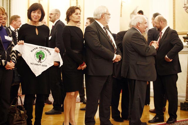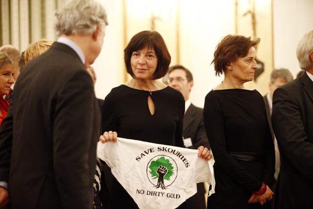 Η Χαρμς, ωστόσο, προχώρησε σε μια κίνηση-έκπληξη. Μπαίνοντας στο Μέγαρο κρατούσε ένα πανό στο οποίο αναγραφόταν: «Save Skouries. No dirty gold», δηλώνοντας έτσι τη συμπαράστασή της στους κατοίκους της Χαλκιδικής.