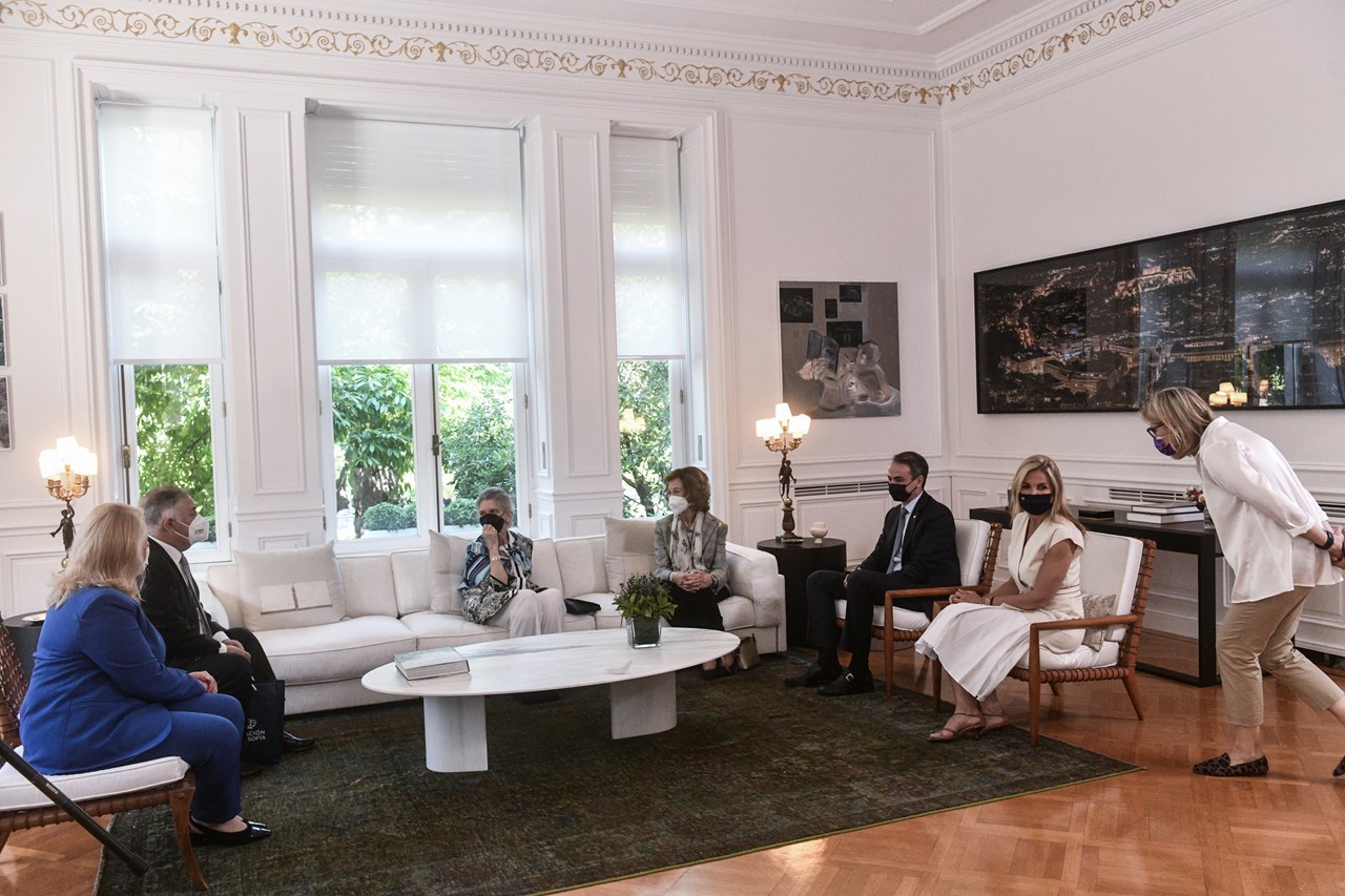 Τη βασίλισσα της Ισπανίας Σοφία, συνοδευόμενη από την αδερφή της Ειρήνη, υποδέχθηκαν νωρίτερα στο Μέγαρο Μαξίμου ο πρωθυπουργός Κυριάκος Μητσοτάκης και η σύζυγός του Μαρέβα Γκραμπόφσκι-Μητσοτάκη. Στην αρχή της συνάντησης ο πρωθυπουργός και η σύζυγός του παρουσίασαν τα έργα τέχνης νέων καλλιτεχνών που εκτίθενται περιοδικά στο Μέγαρο Μαξίμου και περιλαμβάνουν ποικίλες μορφές τέχνης: ζωγραφική, γλυπτική και φωτογραφία.
