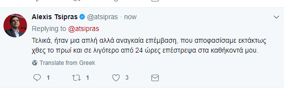 «Τελικά, ήταν μια απλή αλλά αναγκαία επέμβαση, που αποφασίσαμε εκτάκτως χθες το πρωί και σε λιγότερο από 24 ώρες επέστρεψα στα καθήκοντά μου», αναφέρει χαρακτηριστικά.