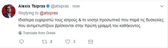 Ο Αλέξης Τσίπρας αναφέρει συγκεκριμένα στην ανάρτηση του: «Ιδιαίτερα ευχαριστώ τους ιατρούς & το νοσηλ. προσωπικό που παρά τις δυσκολίες που αντιμετωπίζουν βρίσκονται στην πρώτη γραμμή του καθήκοντος».