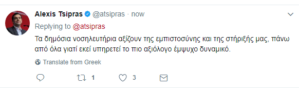 Ο πρωθυπουργός σε άλλη ανάρτησή του τονίζει: «Τα δημόσια νοσηλευτήρια αξίζουν της εμπιστοσύνης και της στήριξής μας, πάνω από όλα γιατί εκεί υπηρετεί το πιο αξιόλογο έμψυχο δυναμικό».