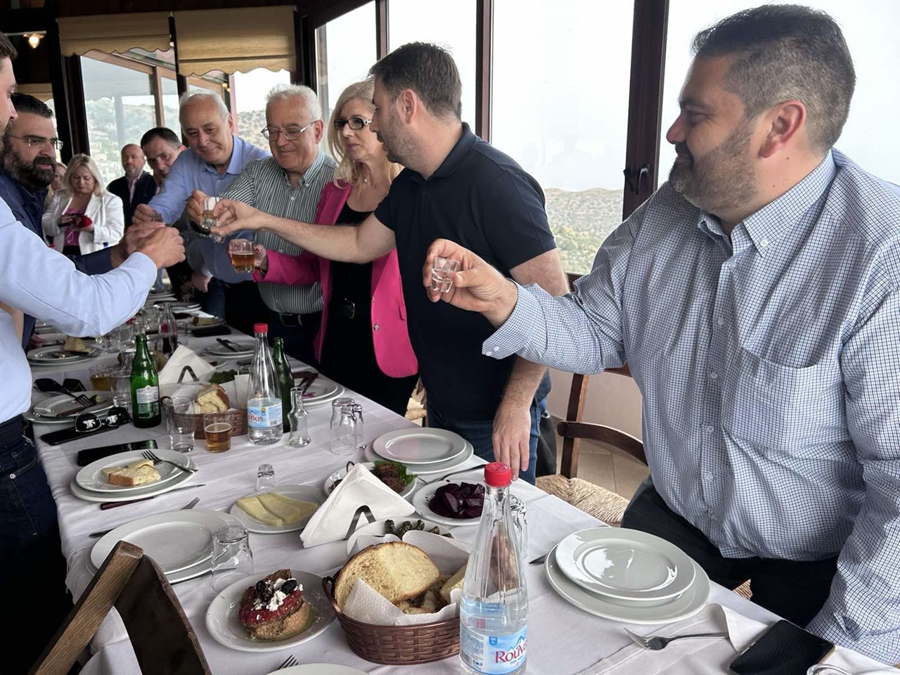 Ο κ. Ανδρουλάκης σε χαλαρό κλίμα, λίγες ώρες μετά την προεκλογική του ομιλία στο Ηράκλειο και λίγες ώρες πριν ανοίξουν οι κάλπες, είχε τη δυνατότητα να συζητήσει χαλαρά με τους παρευρισκόμενους, να γευτεί κρητικούς μεζέδες και τσικουδιά.