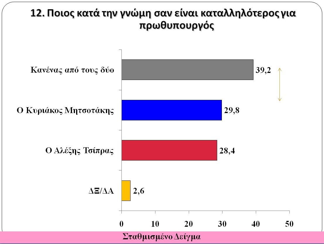 Στην κλασσική πια ερώτηση ποιος κατά τη γνώμη σας είναι καταλληλότερος για πρωθυπουργός η απάντηση «Κανένας από τους δύο» έρχεται πρώτη με 39,2%. Ο Κυριάκος Μητσοτάκης προηγείται κατά 1,4 ποσοστιαία μονάδα του Αλέξη Τσίπρα. Το εύρος της διαφοράς δηλαδή έχει εκμηδενιστεί.