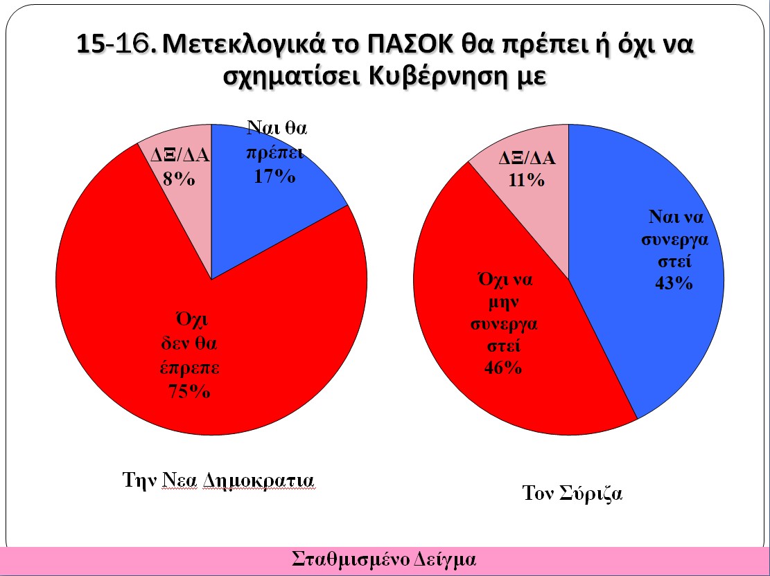 Είναι χαρακτηριστικό πώς ενώ το 43% των ψηφισάντων προκρίνει μία μετεκλογική συνεργασία επί κυβερνητικού επιπέδου του ΠΑΣΟΚ με τον ΣΥΡΙΖΑ, το ποσοστό αυτό θετικής στάσης σε μία συγκυβέρνηση μειώνεται στο μόλις 17% όταν αυτή η προοπτική αφορά το ΠΑΣΟΚ με τη Νέα Δημοκρατία.