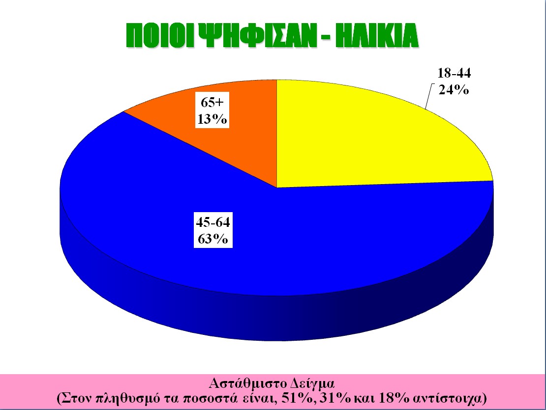 2) Το 24% των πολιτών που ψήφισαν ανήκει στην ηλικιακή κατηγορία 17 – 44 ενώ το 63% στην κατηγορία των 45- 64 . Το 13% ανήκει στην κατηγορία των άνω των 65.