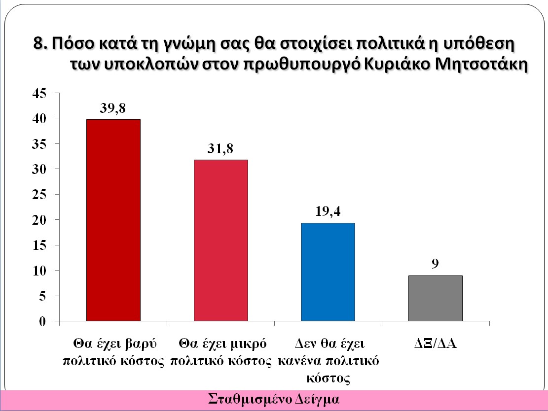 8) Στο επόμενο γράφημα καταγράφονται οι εκτιμήσεις των πολιτών ως προς την σοβαρότητα των επιπτώσεων από την υπόθεση των υποκλοπών. Μοιρασμένες οι απαντήσεις λοιπόν. Το 39,8% θεωρεί πώς θα υπάρχει βαρύ πολιτικό κόστος για τον Κυριάκο Μητσοτάκη. Το 31,8% εκτιμά πως θα υπάρχει μικρό πολιτικό κόστος για τον πρωθυπουργό. Το 19,4% εκτιμά πώς δεν θα υπάρξει κανένα πολιτικό κόστος. Ένα 9% δεν παίρνει θέση και δηλώνει δεν ξέρω δεν απαντώ.