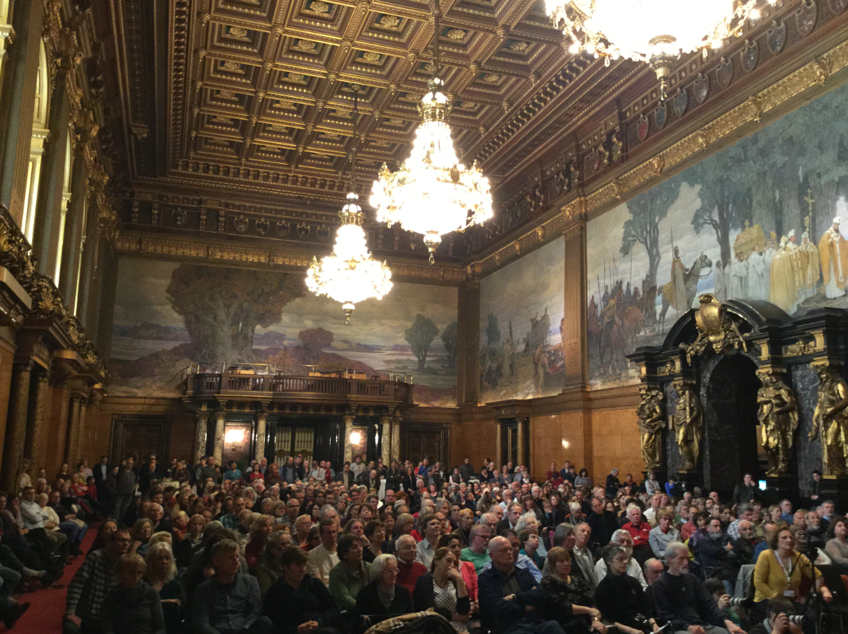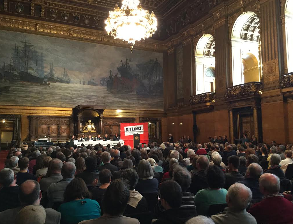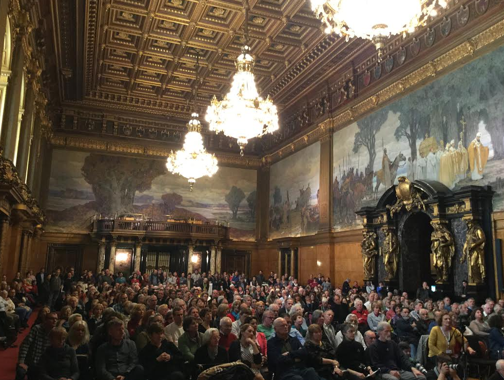 Με μεγαλειώδη συγκέντρωση στο δημαρχείο του Αμβούργου συνεχίστηκε το Σάββατο η περιοδεία του Μανώλη Γλεζου στη Γερμανία για το θέμα των γερμανικών οφειλών στην Ελλάδα.