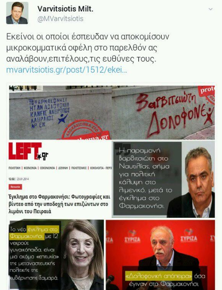 Σκληρή κριτική άσκησε μέσω της προσωπικής του ιστοσελίδας και του προσωπικού λογαριασμού στο Twitter, ο Τομεάρχης Μεταναστευτικής Πολιτικής της Νέας Δημοκρατίας – βουλευτής Β’ Αθηνών, Μιλτιάδης Βαρβιτσιώτης, κατά των κ.κ. Πάνου Σκουρλέτη, Δημήτρη Βίτσα και Τασίας Χριστοδουλοπούλου, με αφορμή το σημερινό τραγικό συμβάν στα ανοιχτά της Λέσβου.