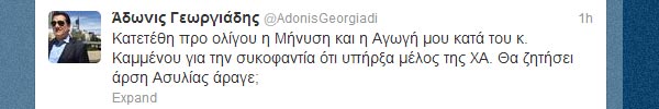 Πριν από λίγο ο Άδωνις Γεωργιάδης ενημέρωσε τους φίλους του στο twitter ότι κατέθεσε μήνυση κατά του Πάνου Καμμένου εξαιτίας των δηλώσεών του ότι υπήρξε μέλος της Χρυσής Αυγής.