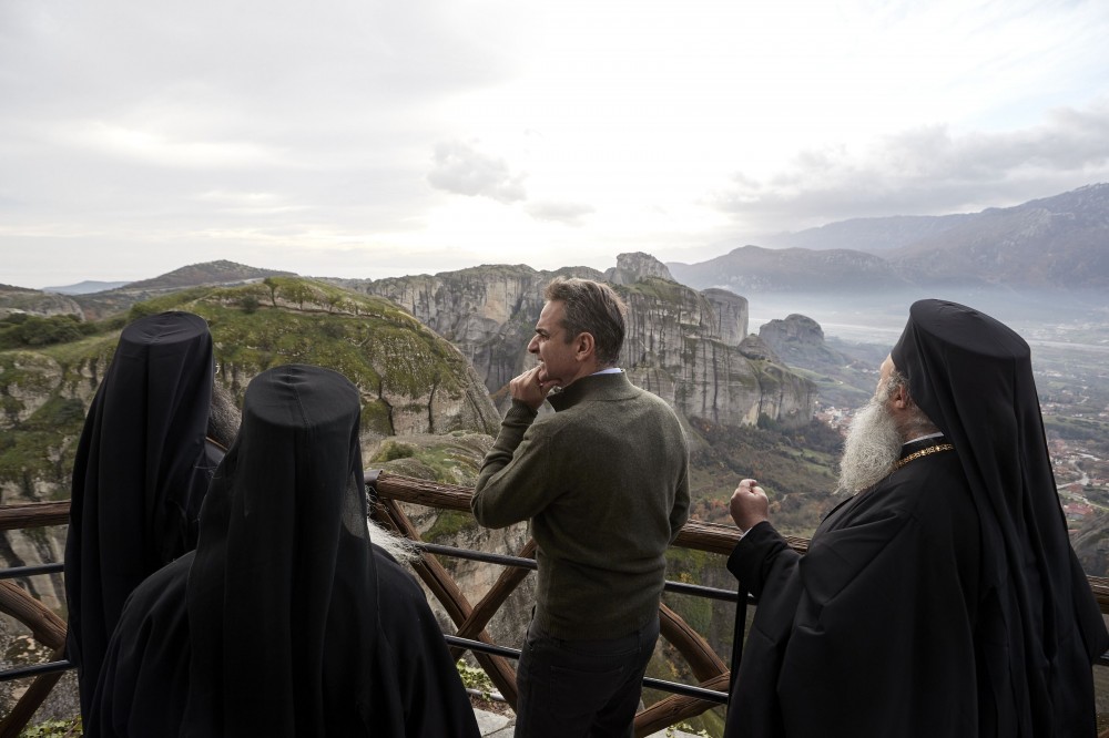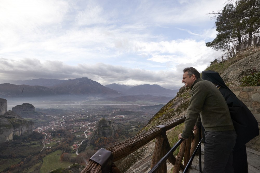 Τον θαυμασμό του στους πρώτους μοναχούς οι οποίοι εγκαθίδρυσαν τον μοναχισμό «σε αυτούς τους αφιλόξενους βράχους», «στην κυριολεξία μεταξύ ουρανού και γης» εξέφρασε ο πρωθυπουργός ο Κυριάκος Μητσοτάκης, ο οποίος σήμερα το πρωί επισκέφθηκε δύο ιστορικές Μονές των Μετεώρων, τη Μονή της Μεταμόρφωσης του Σωτήρος, γνωστή και ως «Μεγάλο Μετέωρο», και τη Μονή Αγίου Στεφάνου. Παράλληλα από τον ιερό αυτόν τόπο, ο πρωθυπουργός επισήμανε την ανάγκη να στηριχθούν οι πιο αδύναμοι συμπολίτες μας «ειδικά αυτές τις άγιες μέρες, ώστε η χαρά του Χριστού να φτάσει σε κάθε σπίτι».