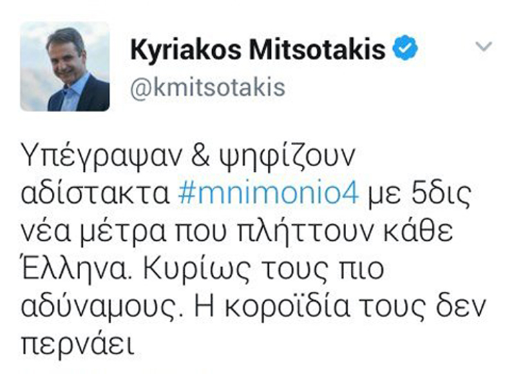 Μέσω του προσωπικού του λογαριασμού στο Twitter, ο κ. Μητσοτάκης έγραψε: «Υπέγραψαν και ψηφίζουν αδίστακτα το μνημόνιο 4, με 5 δις € νέα μέτρα, που πλήττουν κάθε Έλληνα. Κυρίως τους πιο αδύναμους. Η κοροϊδία τους, δεν περνάει».