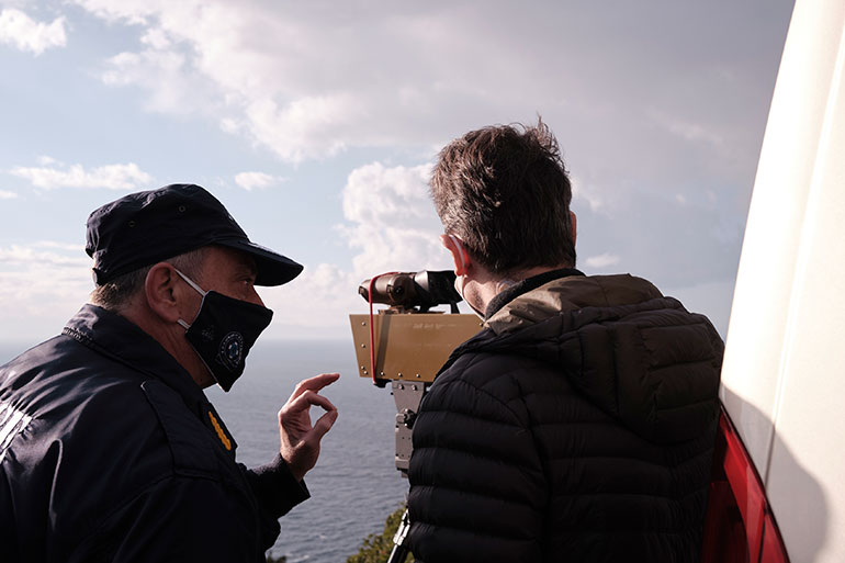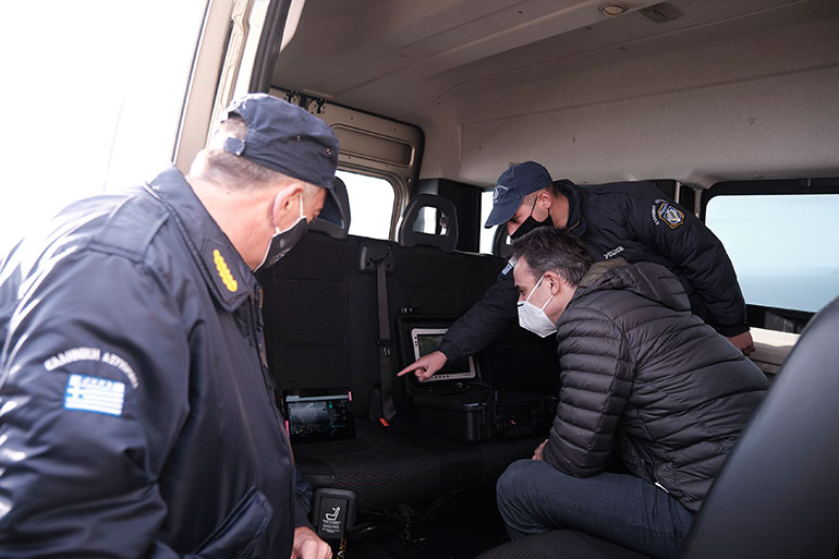 Πρώτος σταθμός της περιοδείας του Κυριάκου Μητσοτάκη στη Λέσβο ήταν σε έναν από τους κινητούς σταθμούς επιτήρησης των θαλάσσιων συνόρων της ΕΛ.ΑΣ., όπου ενημερώθηκε από τον αστυνομικό διευθυντή βορείου Αιγαίου Λευτέρη Ντουρουντούς για την επόπτευση της θάλασσας με σύγχρονα μέσα σε συνεργασία με το Λιμενικό.