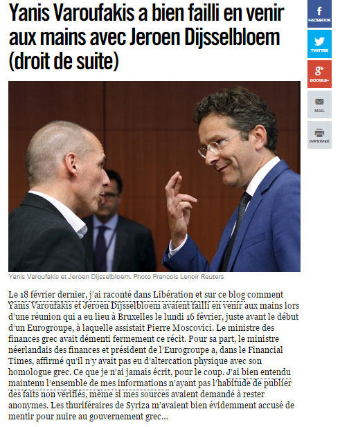 «Αυτό συνέβη κατά τη διάρκεια μιας συνάντησης (σ.σ. στις 16 Φεβρουαρίου) ανάμεσα στον Ντάισελμπλουμ, τον Βαρουφάκη και εμένα… Παραλίγο να παλέψουν. Κατηγόρησαν ο ένας τον άλλο ότι είναι ψεύτης. Χρειάστηκε να μπω ανάμεσά τους… Κατάφερα να τους χωρίσω. Αλλά δεν κατάφερα να τους φέρω κοντά ξανά. Δεν μίλησαν πραγματικά ο ένας στον άλλο μετά από αυτό».