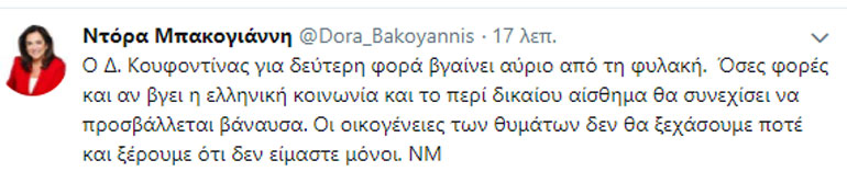 Τη διήμερη άδεια που χορηγήθηκε στον Δημήτρη Κουφοντίνα σχολιάζει με ανάρτησή της στο Twitter η βουλευτής της ΝΔ Ντόρα Μπακογιάννη.