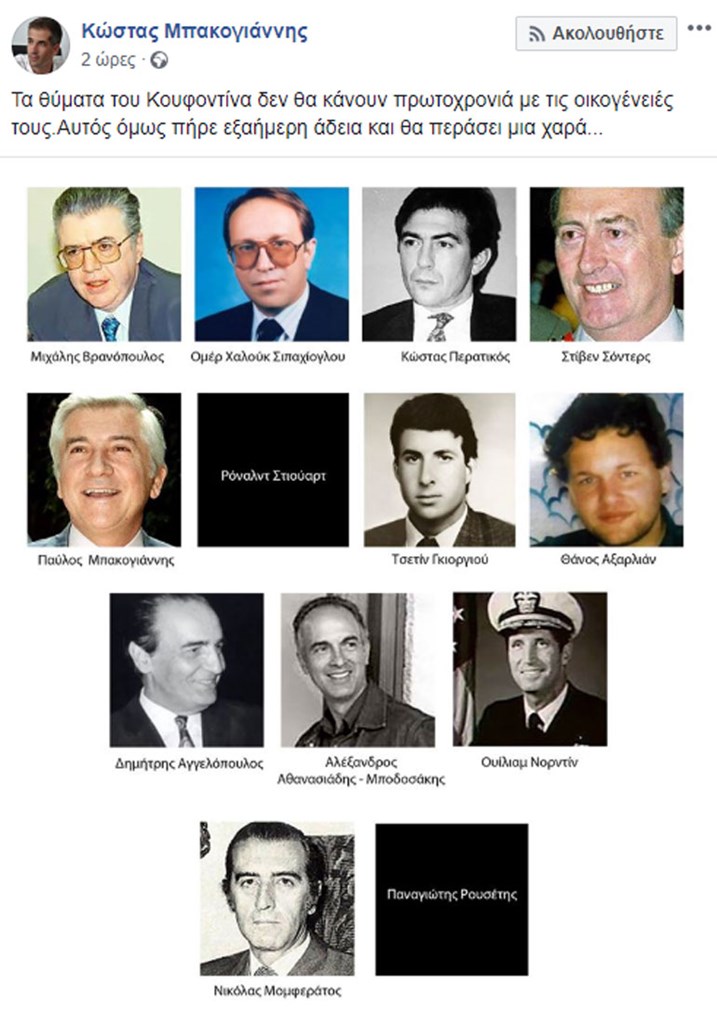 «Τα θύματα του Κουφοντίνα δεν θα κάνουν πρωτοχρονιά με τις οικογένειές τους.Αυτός όμως πήρε εξαήμερη άδεια και θα περάσει μια χαρά…», έγραψε ο Κώστας Μπακογιάννης και ανήρτησε μία φωτογραφία των θυμάτων της 17 Νοέμβρη, ανάμεσα τους και του πατέρα του, Παύλου Μπακογιάννη.