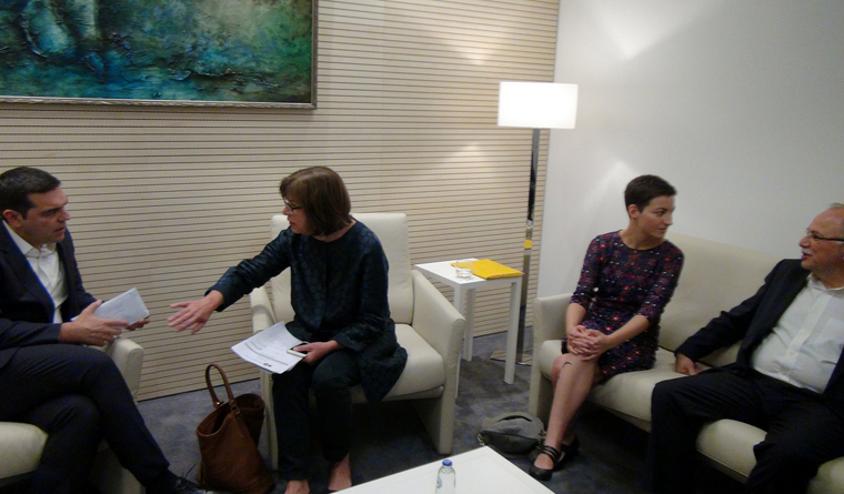 Στη συνέχεια είχε «ραντεβού» με την πρόεδρο της Ευρωομάδας της Αριστεράς Γκάμπι Τσίμερ και στη συζήτηση ήταν παρόντες ο αναπληρωτής υπουργός Εξωτερικών Νίκος Ξυδάκης, ο Νίκος Παππάς, ο ευρωβουλευτής του ΣΥΡΙΖΑ και αντιπρόεδρος του Ευρωπαϊκού Κοινοβουλίου Δημήτρης Παπαδημούλης καθώς και η γενική γραμματέας της Ευρωομάδας της Αριστεράς Μαρία Ντ’ Αλιμόντε.
