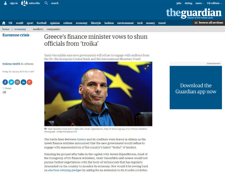 «Δεν θέλουμε παράταση του προγράμματος, δεν θα συνεργαστούμε με αυτή τη σαθρά δομημένη επιτροπή, την Τρόικα» δήλωσε ο Γ. Βαρουφάκης και ο Ντάισελμπλουμ, έκπληκτος, έσπευσε να αποχωρήσει με έναν τυπικό χαιρετισμό από τον πρώτο αναγνωριστικό γύρο επαφών με τη νέα κυβέρνηση.