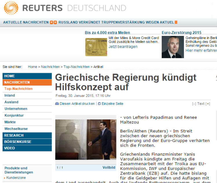 Παράλληλα, στη γερμανική έκδοση του Reuters αναφέρεται ότι «η ελληνική κυβέρνηση διαρρηγνύει τη συμφωνία, ενώ κατά τη διάρκεια των συνομιλιών διεφάνη ότι υπάρχει χάσμα απόψεων μεταξύ Αθήνας και δανειστών, με το αφεντικό του Eurogroup να απειλεί την Ελλάδα σε περίπτωση που προβεί σε μονομερείς αποφάσεις».