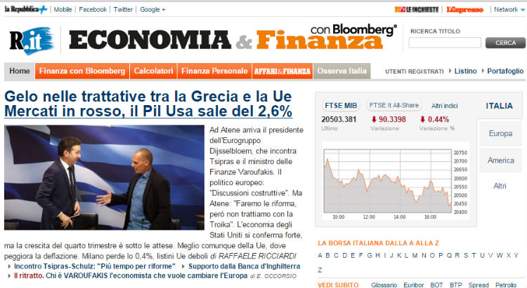 Σχολιάζοντας τις δηλώσεις του Γ. Βαρουφάκη για την επιθυμία της κυβέρνησής του να μη συνεργαστεί με την Τρόικα, το Bloomberg σχολιάζει πως «το αδιέξοδο θα μπορούσε να οδηγήσει σε αποκλεισμό των ελληνικών τραπεζών από τις πράξεις ρευστότητας της Ευρωπαϊκής Κεντρικής Τράπεζας και να αφήσει την κυβέρνηση χωρίς πηγή χρηματοδότησης, καθώς θα έχει απορρίψει τη βοήθεια της ΕΕ ενώ παραμένει αποκλεισμένη από τις διεθνείς αγορές.