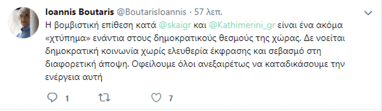 «Χτύπημα ενάντια στους δημοκρατικούς θεσμούς της χώρας», χαρακτηρίζει τη βομβιστική επίθεση κατά του τηλεοπτικού σταθμού ΣΚΑΪ, ο δήμαρχος Θεσσαλονίκης, Γιάννης Μπουτάρης, με ανάρτησή του στο twitter.