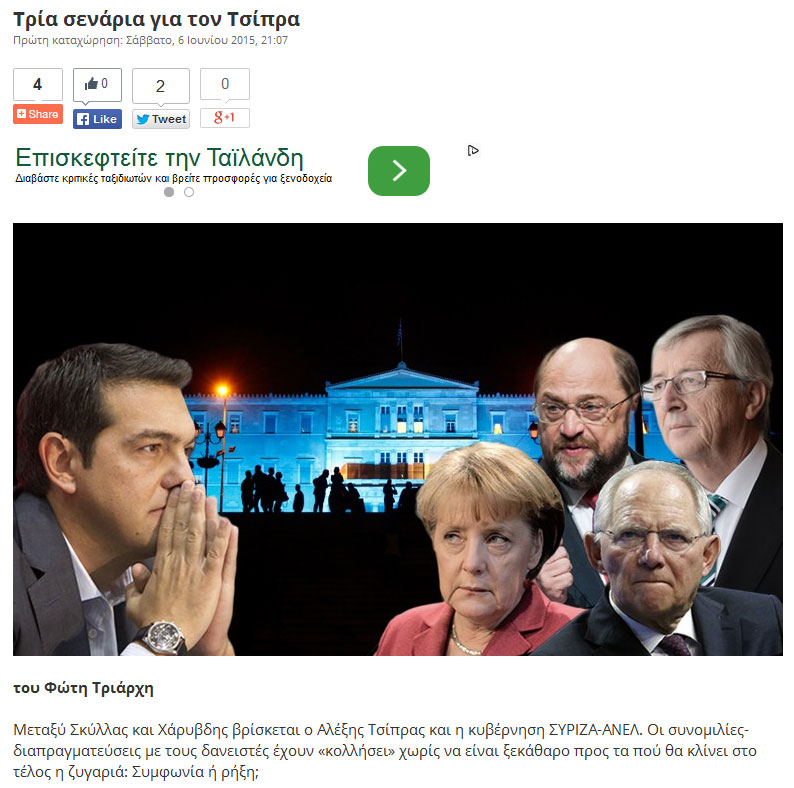 Σε δύσκολη θέση η ελληνική κυβέρνηση λόγω της ανυποχώρητης στάσης των δανειστώνΣτο τραπέζι υπάρχουν ουσιαστικά τρία σενάρια, το καθένα από τα οποία επηρεάζει σε μεγαλύτερο ή μικρότερο βαθμό τους πολίτες και οδηγεί σε διαφορετικές πολιτικές εξελίξεις. Το καλό σενάριο είναι να υπάρξει συμφωνία και να αποφευχθούν τα σκληρά μέτρα (π.χ. κατάργηση ΕΚΑΣ).