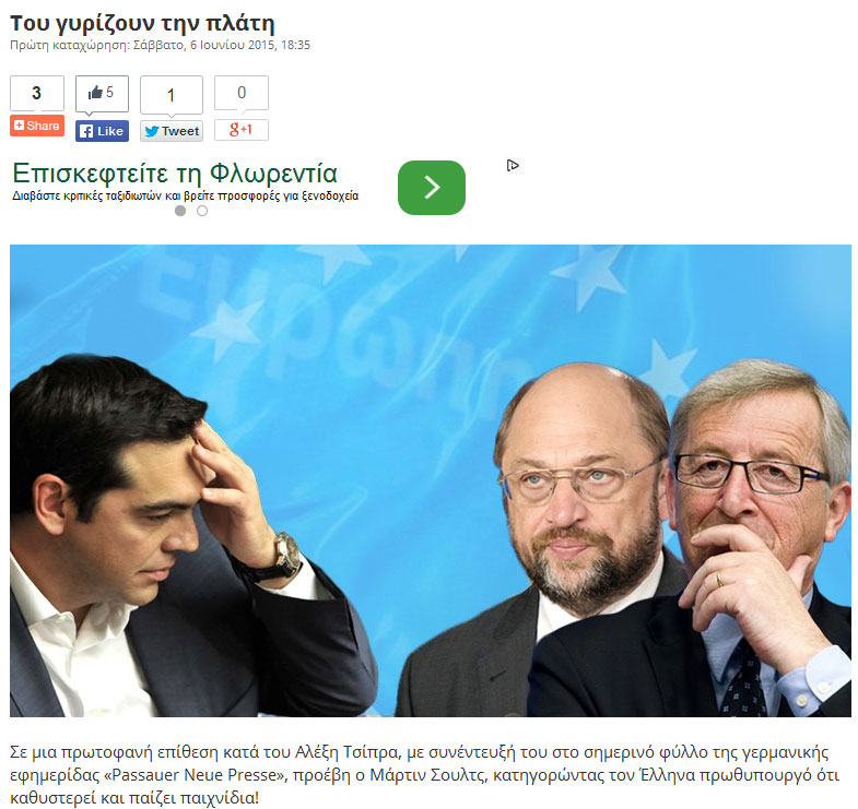 Ενδεικτική του κλίματος που έχει διαμορφωθεί στην Ευρώπη είναι η πρωτοφανής επίθεση που εξαπέλυσε κατά του Αλέξη Τσίπρα ο πρόεδρος του Ευρωπαϊκού Κοινοβουλίου Μάρτιν Σουλτς, ο οποίος σε συνέντευξή του στη γερμανική εφημερίδα «Passauer Neue Presse» κάλεσε τον Έλληνα πρωθυπουργό «να σταματήσει να παίζει παιχνίδια».