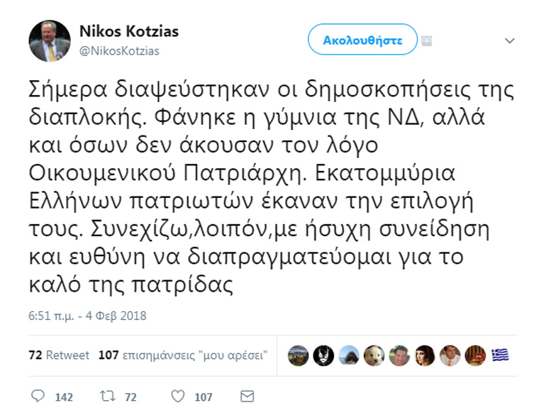 «Σήμερα» όπως γράφει ο Ν. Κοτζιάς «διαψεύστηκαν οι δημοσκοπήσεις της διαπλοκής. Φάνηκε η γύμνια της ΝΔ αλλά και όσων δεν άκουσαν τον λόγο του Οικουμενικού Πατριάρχη. Εκατομμύρια Ελλήνων πατριωτών έκαναν την επιλογή τους. Συνεχίζω, λοιπόν, με ήσυχη συνείδηση και ευθύνη να διαπραγματεύομαι για το καλό της πατρίδας».