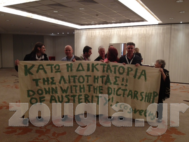 «Κάτω η δικτατορία της λιτότητας». Αυτό ήταν το σύνθημα που αναγραφόταν στο πανό μελών ευρωπαϊκών πράσινων κομμάτων, που έκαναν παρέμβαση κατά τη διάρκεια ομιλίας των ευρωβουλευτών των Πρασίνων/EFA, με επικεφαλής τον Ντανιέλ Κον Μπεντίτ.
