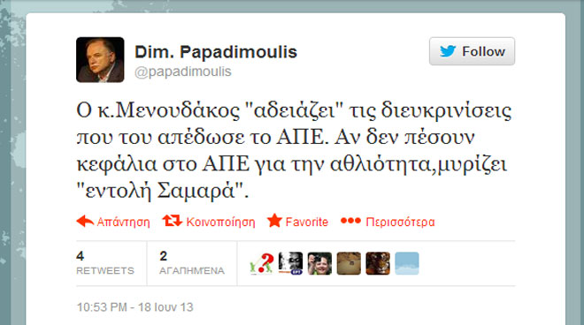 Γράφει χαρακτηριστικά ο Δημήτρης Παπαδημούλης: «Ο κ.Μενουδάκος “αδειάζει” τις διευκρινίσεις που του απέδωσε το ΑΠΕ. Αν δεν πέσουν κεφάλια στο ΑΠΕ για την αθλιότητα, μυρίζει “εντολή Σαμαρά”».
