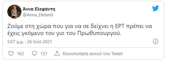 «Ο πρωθυπουργός, στη συνέχεια η σύζυγός του και τώρα ο γιος του και μια παγκόσμιου επιπέδου αθλήτρια. Στόχος πάντα ο Κυρ. Μητσοτάκης», αναφέρεται σε ανακοίνωση του Γραφείου Τύπου της Νέας Δημοκρατίας, με αφορμή ανάρτηση στο twitter της Άννας Ελεφάντη, μέλους του ΣΥΡΙΖΑ.