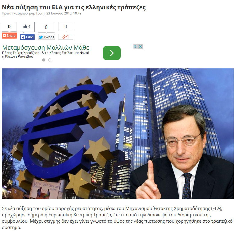 Σε νέα αύξηση του ορίου παροχής ρευστότητας στις ελληνικές τράπεζες, μέσω του Μηχανισμού Έκτακτης Χρηματοδότησης (ELA), προχώρησε την Τετάρτη η Ευρωπαϊκή Κεντρική Τράπεζα.
