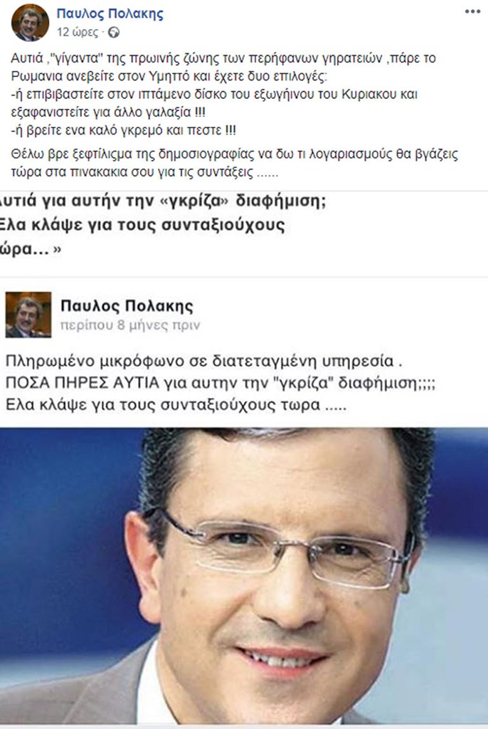 Η παλαιότερη ανάρτηση αναπληρωτή υπουργού για τον δημοσιογράφο έγραφε: «Πληρωμένο μικρόφωνο σε διατεταγμένη υπηρεσία. ΠΟΣΑ ΠΗΡΕΣ ΑΥΤΙΑ γι αυτή την «γκρίζα» διαφήμιση;;;;;;;; Ελα κλάψε για τους συνταξιούχους τώρα».