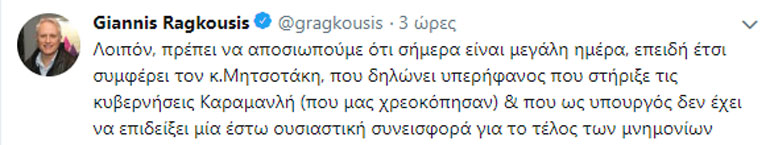 «Λοιπόν, πρέπει να αποσιωπούμε ότι σήμερα είναι μεγάλη ημέρα, επειδή έτσι συμφέρει τον κ.Μητσοτάκη, που δηλώνει υπερήφανος που στήριξε τις κυβερνήσεις Καραμανλή (που μας χρεοκόπησαν) & που ως υπουργός δεν έχει να επιδείξει μία έστω ουσιαστική συνεισφορά για το τέλος των μνημονίων», έγραψε στο Twitter.