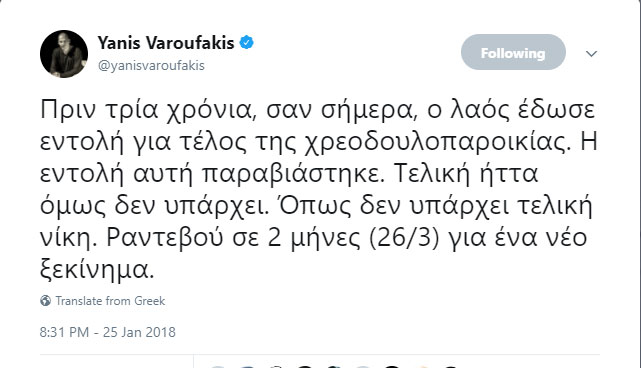 «Πριν τρία χρόνια, σαν σήμερα, ο λαός έδωσε εντολή για τέλος της χρεοδουλοπαροικίας. Η εντολή αυτή παραβιάστηκε. Τελική ήττα όμως δεν υπάρχει. Όπως δεν υπάρχει τελική νίκη. Ραντεβού σε 2 μήνες (26/3) για ένα νέο ξεκίνημα», ανέφερε χαρακτηριστικά ο Γιάννης Βαρουφάκης.