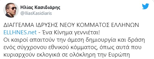 Ο Ηλίας Κασιδιάρης ανακοίνωσε ότι ιδρύει δικό του κόμμα. Όπως ανέφερε σε βίντεο στο κανάλι του στο YouTube: «Ο Ηλίας Κασιδιάρης δεν μετέχει πλέον στο κόμμα της Χρυσής Αυγής, διότι η πρόταση που κατέθεσε για πλήρη αναδιοργάνωση και ανανέωση δεν έγινε αποδεκτή. Έγιναν εκτενείς συζητήσεις, αλλά δυστυχώς υπήρξε απόλυτη διαφωνία».