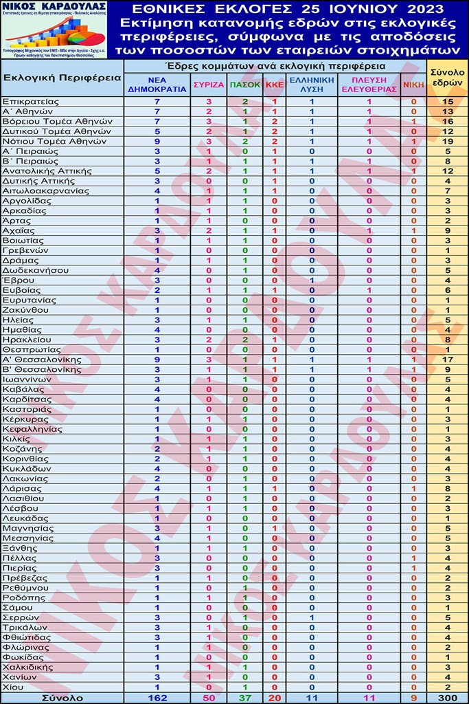Ο Νίκος Καρδούλας έστειλε στη «Ζούγκλα» την εκτίμηση κατανομής εδρών ανά εκλογική περιφέρεια σύμφωνα με τις αποδόσεις των εταιρειών στοιχημάτων.