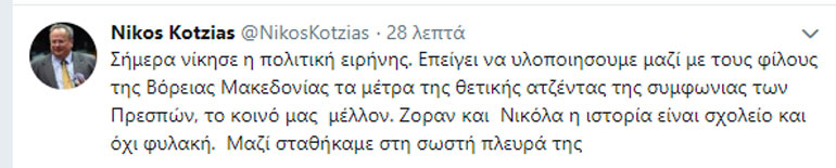 «Σήμερα νίκησε η πολιτική ειρήνης. Επείγει να υλοποιήσουμε μαζί με τους φίλους της Βόρειας Μακεδονίας τα μέτρα της θετικής ατζέντας της συμφωνίας των Πρεσπών, το κοινό μας μέλλον. Ζόραν και Νικόλα η ιστορία είναι σχολείο και όχι φυλακή. Μαζί σταθήκαμε στη σωστή πλευρά της» έγραψε σε ανάρτησή του στον προσωπικό του λογαριασμό στο Twitter ο πρώην υπουργός Εξωτερικών Νίκος Κοτζιάς.