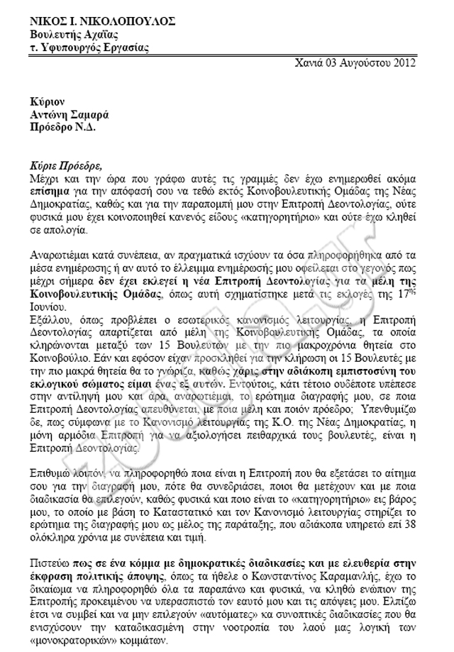 Η επιστολή του Ν. Νικολόπουλου στον Α. Σαμαρά, Πρώτη καταχώρηση: Κυριακή, 5 Αυγούστου 2012, 10:09