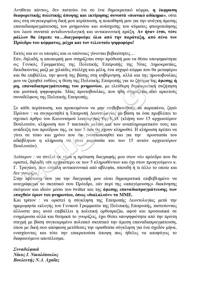 Την επιστολή που απέστειλε ο πρώην υφυπουργός Εργασίας Νίκος Νικολόπουλος προς τον Αντώνη Σαμαρά μετά τη διαγραφή του από την Κοινοβουλευτική Ομάδα της ΝΔ, παρουσιάζει αποκλειστικά η zougla.gr