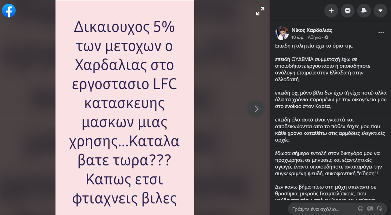 Ο Νίκος Χαρδαλιάς χρησιμοποίησε τον προσωπικό του λογαριασμό στο Facebook για να απαντήσει στα fake news που τον θέλουν να είναι μέτοχος σε εργοστάσιο παραγωγής μασκών.