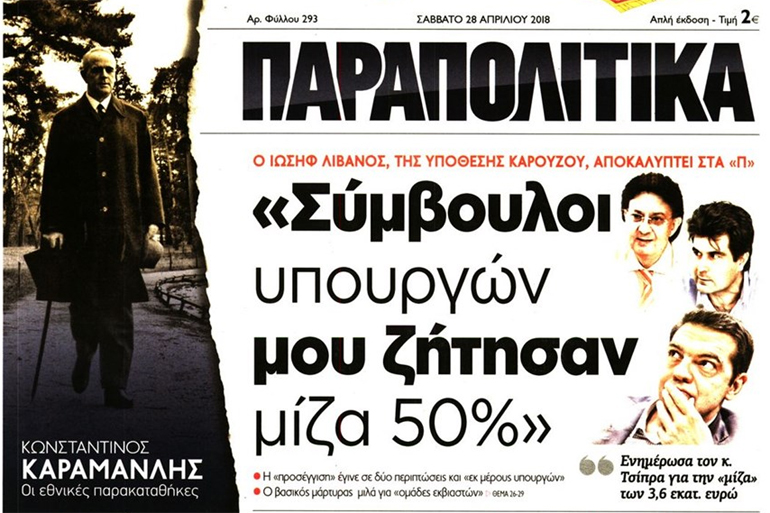 Ο τίτλος του θέματος είναι «Σύμβουλοι υπουργών μου ζήτησαν μίζα 50%» και αναφέρεται: «Ο βασικός μάρτυρας κατηγορίας στο σκάνδαλο “Καρούζος-gate”, Ιωσήφ Λιβανός μιλάει στα “Π” και κάνει αποκαλύψεις-φωτιά – Καταγγέλλει απειλές και πιέσεις για μίζα 3,6 εκατ. ευρώ σε αναπληρωτή υπουργό, στενό συνεργάτη του Τσίπρα και σε σύμβουλο του Τσακαλώτου».