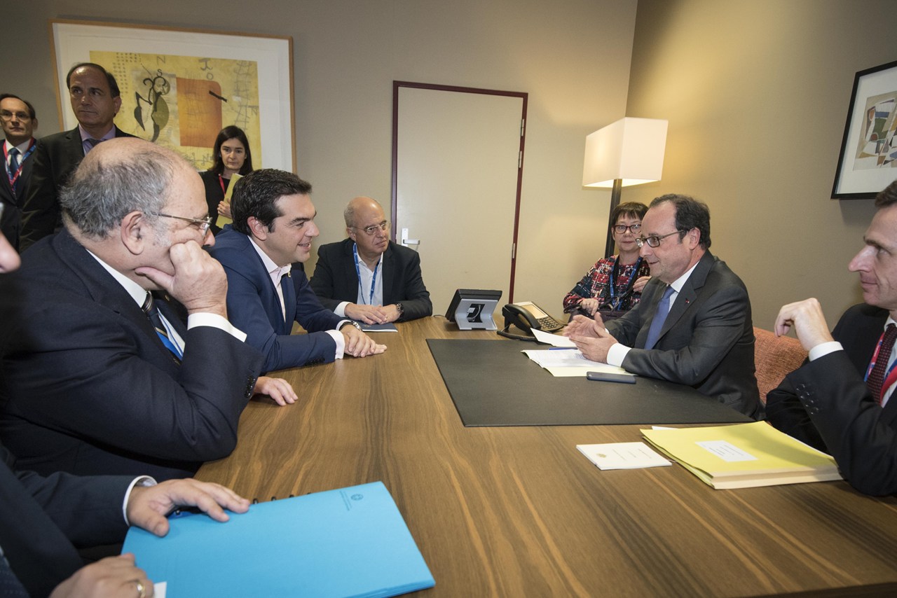 Ερωτηθείς, κατά τη διάρκεια της συνέντευξης Τύπου που παραχώρησε, μετά το πέρας των εργασιών της συνόδου κορυφής, για το περιεχόμενο της συζήτησης που είχε το πρωί της Παρασκευής με τον Έλληνα πρωθυπουργό Αλέξη Τσίπρα, ο κ. Ολάντ ανέφερε ότι η Γαλλία ενθαρρύνει όλους τους εμπλεκόμενους παράγοντες, όπως η Ευρωπαϊκή Επιτροπή, η Ευρωπαϊκή Κεντρική Τράπεζα και το Διεθνές Νομισματικό Ταμείο, να λάβουν τις αναγκαίες αποφάσεις, σημειώνοντας, ταυτόχρονα, πως και η Ελλάδα πρέπει να τηρήσει τις δεσμεύσεις της.