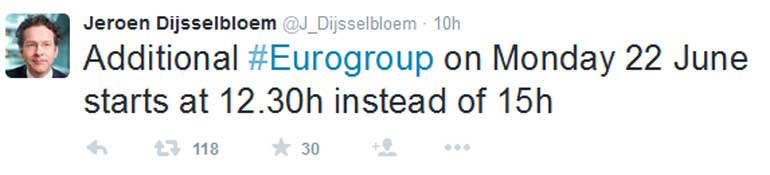 Σύμφωνα με τον πρόεδρο του Eurogroup η συνεδρίαση θα αρχίσει στις 13:30 (ώρα Ελλάδας) αντί για τις 16:00.