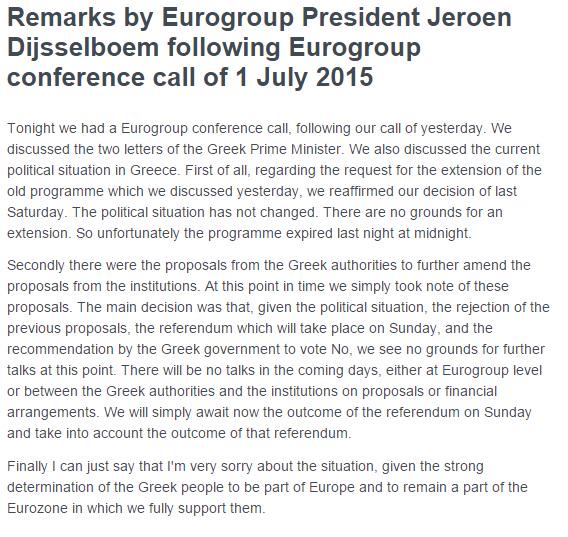 Διαβάστε επίσης: Ολοκληρώθηκε η συνεδρίαση του Eurogroup – «Πάγωμα» των διαπραγματεύσεων μέχρι το δημοψήφισμα, Πρώτη καταχώρηση: Τετάρτη, 1 Ιουλίου 2015, 19:35