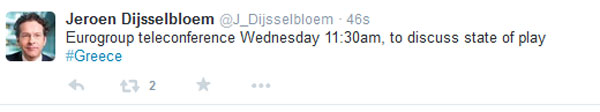 Με ανάρτησή του πριν από λίγη ώρα στο twitter, ο πρόεδρος του Eurogroup Γερούν Ντάισελμπλουμ ενημέρωσε ότι θα πραγματοποιηθεί τηλεδιάσκεψη της Ευρωομάδας στις 11.30 π.μ. ώρα Βρυξελλών (σ.σ. 12.30 μ.μ. ώρα Ελλάδας).