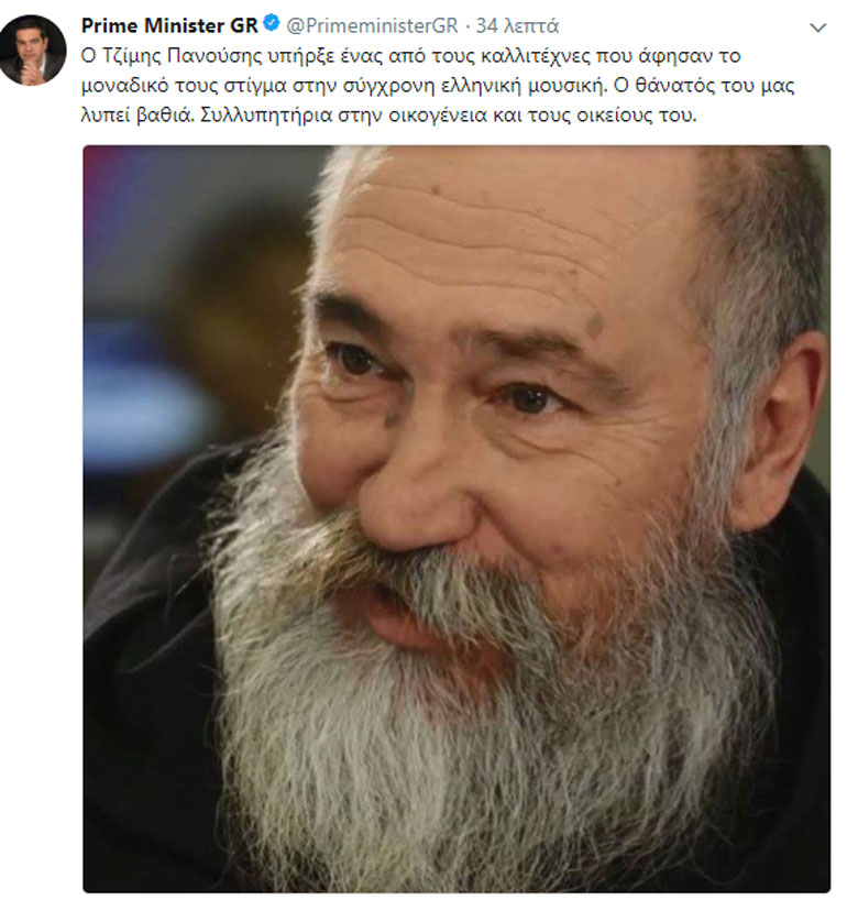 Με ανάρτησή του στο Twitter ο πρωθυπουργός, Αλέξης Τσίπρας, αποχαιρέτησε τον Τζίμη Πανούση.