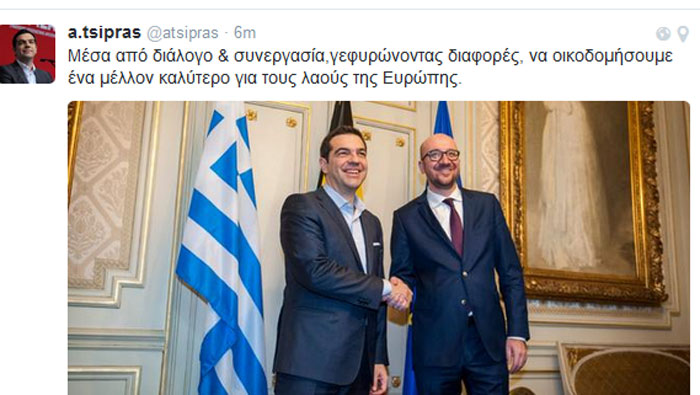 Λίγη ώρα πριν από την έναρξη της Συνόδου Κορυφής ο Αλέξης Τσίπρας ανήρτησε στον προσωπικό του λογαριασμό στο twitter μια φωτογραφία με τον Βέλγο Πρωθυπουργό κ. Σαρλ Μισέλ, με τον οποίο συναντήθηκε νωρίτερα, στο πλαίσιο των επαφών του στις Βρυξέλλες.