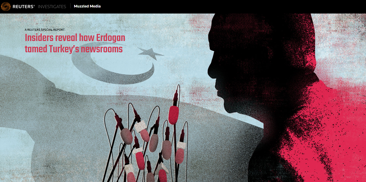 Τα τουρκικά κυρίαρχα μέσα ενημέρωσης που χαρακτηρίζονταν κάποτε από μία ζωντανή σύγκρουση ιδεών, έχουν γίνει μια «σφιχτή αλυσίδα εγκεκριμένων από την κυβέρνηση τίτλων, πρωτοσέλιδων και θεμάτων τηλεοπτικών συζητήσεων. Συνεντεύξεις με δεκάδες πηγές στα μέσα ενημέρωσης, κυβερνητικούς αξιωματούχους και ρυθμιστικές αρχές απεικονίζουν μια βιομηχανία που έχει υποχωρήσει όπως κι άλλοι πρώην ανεξάρτητοι θεσμοί που ο Ερντογάν έχει λυγίσει με τη θέλησή του, συμπεριλαμβανομένων, όπως λένε οι επικριτές του, του δικαστικού σώματος, του στρατού, της κεντρικής τράπεζας και μεγάλων τμημάτων του εκπαιδευτικού συστήματος. Η κυβερνητική πίεση και η αυτολογοκρισία των μέσων ενημέρωσης μοιράζονται την ευθύνη, σύμφωνα με τους ανθρώπους με τους οποίους συνομίλησε το Reuters.